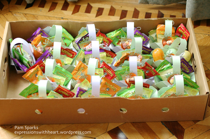 We’ve got grandkids!  Anyone have more than us?! lol  We have 17!  lol  We have so much fun! They range from 15 years old down to 2 months old.  Happy gram!  Saturday I made Easter baskets and Tim filled plastic Easter eggs with dollar bills.  Here’s the box with all 17 baskets  ready to pack in the car for the hunt.  The kids loved them and wanted to keep them too!  YAY!