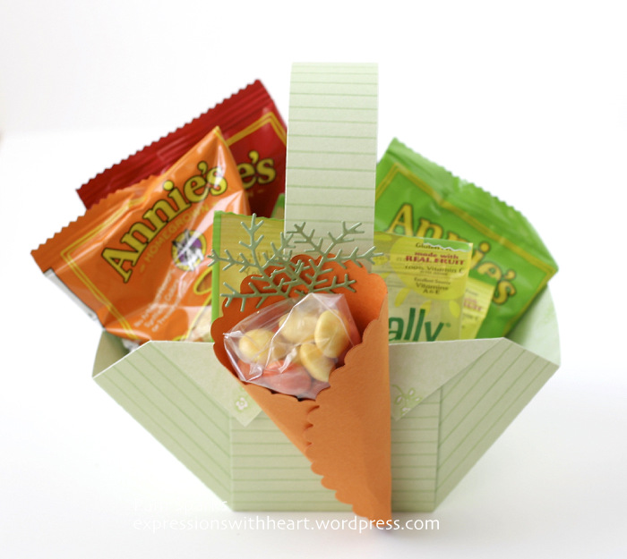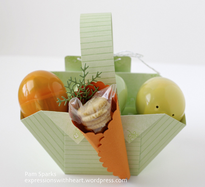The girls baskets were lilac with light green tags.  The paper ‘carrot’ is a scallop circle taped in a cone shape and a couple poppystamps  die sprigs stapled with the tiny attacher for the carrot top!