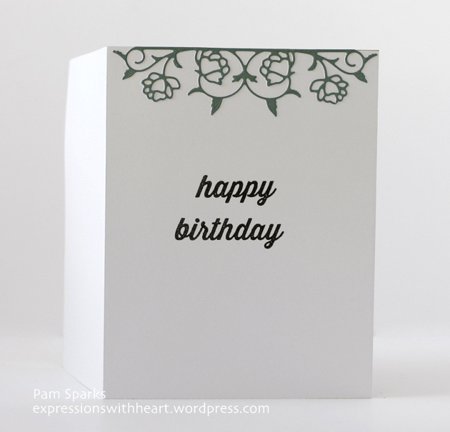 I die cut the NEW Pennington Rose Border die in Juniper card-stock, glued it to the top and stamped the words, happy birthday from the NEW Party Time stamp set.