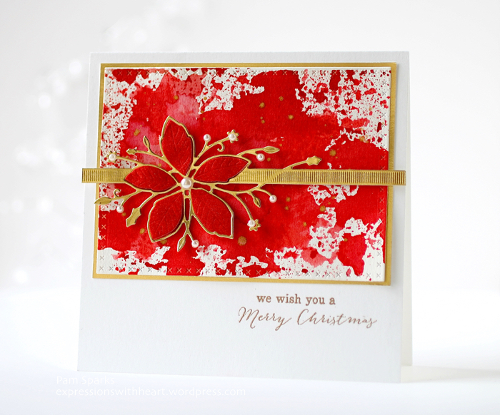 4. You certainly made the “WOW” factor on this card…awesome artwork Pam! Love the smooshing water technique for the background very pretty. Can’t wait to get the new poinsettia ribbon die. A flood of ideas just came to mind. Thanks for sharing Pam, I love all your cards!