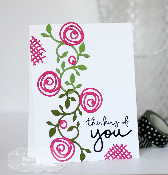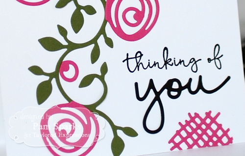 I’m all over the place with these cards today! lol  Here’s a CAS card showing the swirly vine that is in the NEW Bloomers Greenery die set. Again, I used the same two colors of TE cardstock and then added the roses and the crosshatch cuts from the NEW Scribbles die set.  See,  I told you… a lot of NEW stamps and dies this month! : )  The two little rosebuds I cut by hand from the center of the scribbled rose die cut.