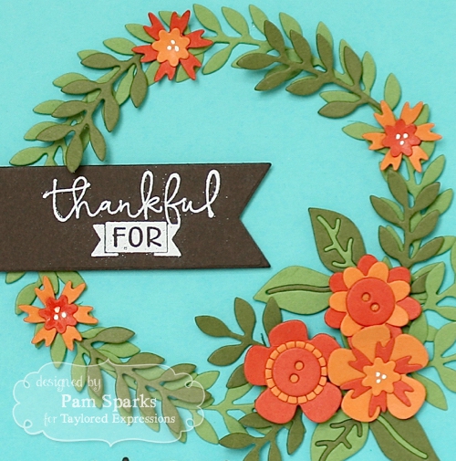 I’m focusing in on the NEW Bloomers Greenery die set today. My thankful for you card uses one of the fern looking branches.  I die cut it several times in two colors of TE cardstock and formed a wreath.  This is an awesome set of dies for making wreaths, bouquets and whatever you can come up with!