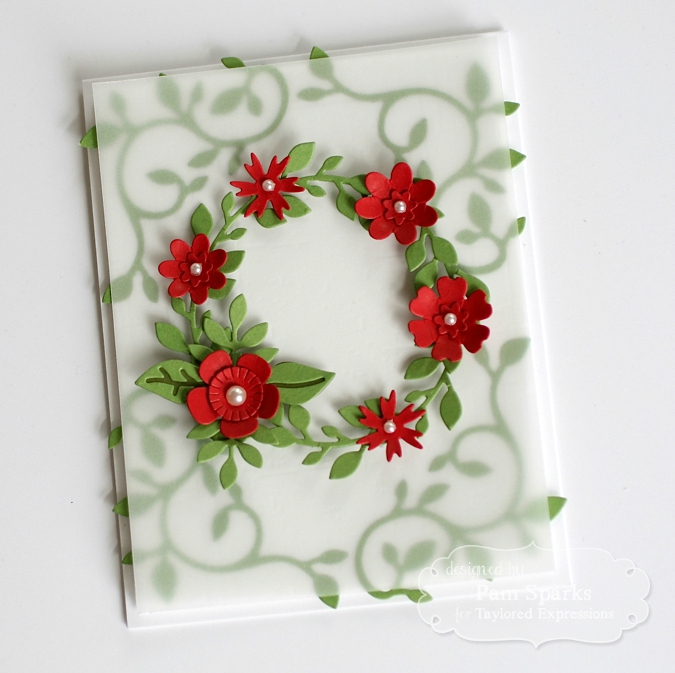 The swirly vine, die cut four times and glued to the card base.  A layer of vellum over that and then the wreath popped up with mounting squares on top.
