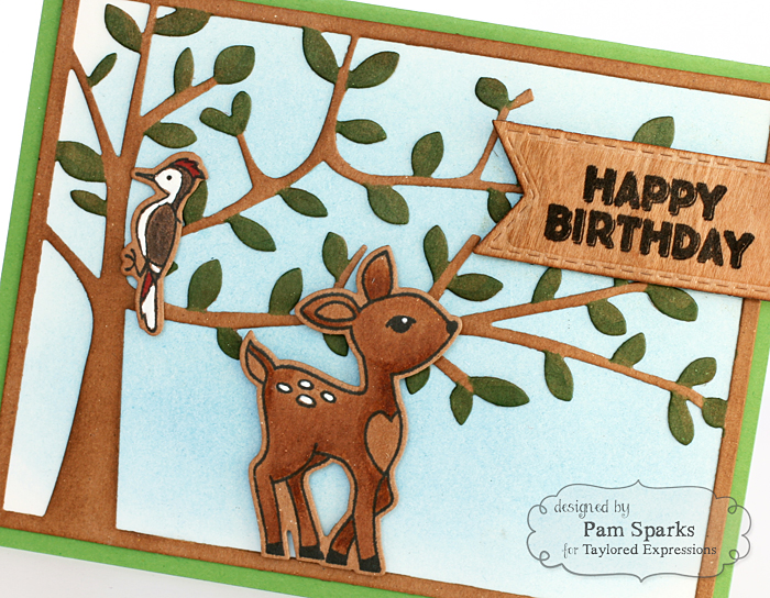 Happy Birthday and the woodpecker are from the set also.  I stamped on woodgrain tape and die cut with the Banner Stacklets Die set.