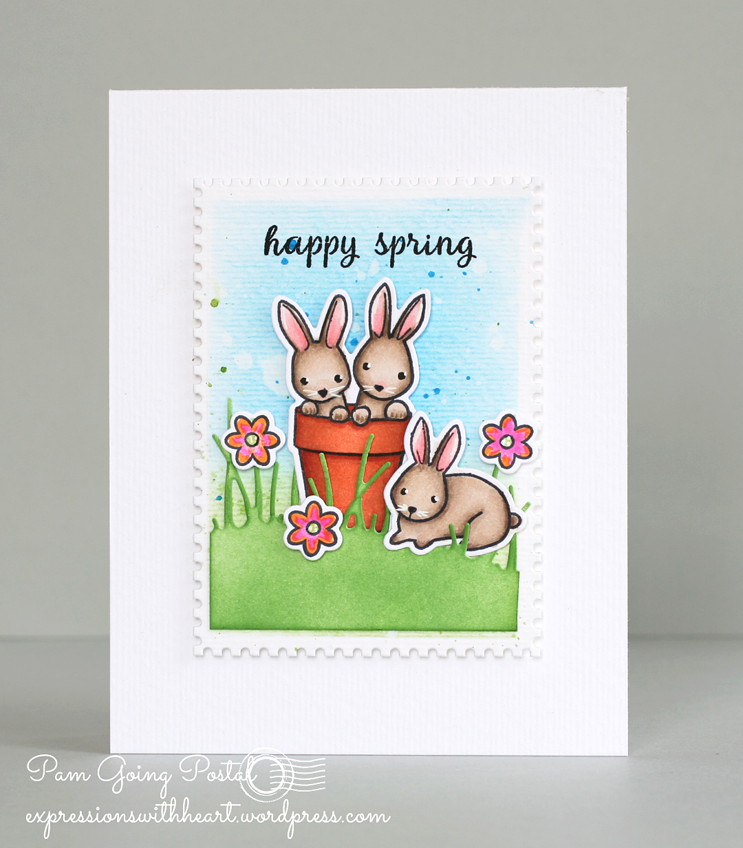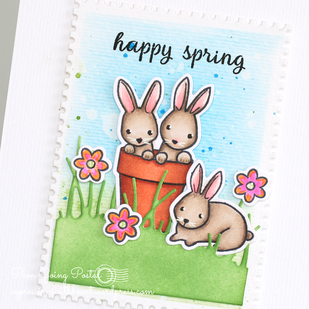 Your little bunnies couldn’t be any cuter!!! Awesome background and love that grass border and postal frame. Well done Pam!