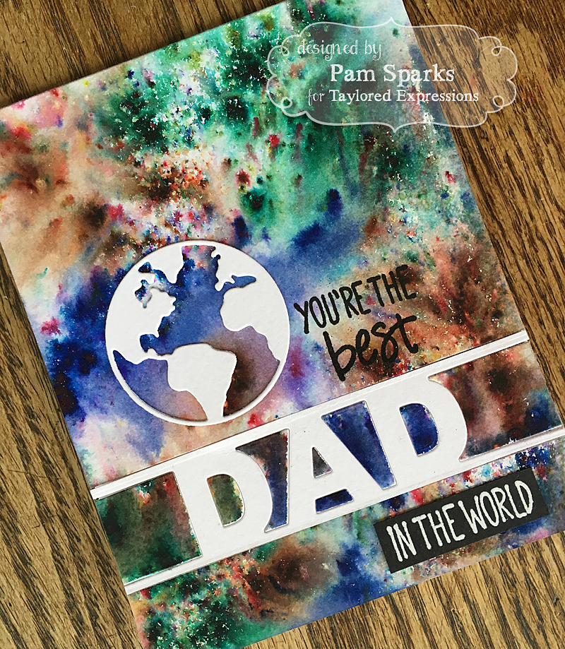 Here I made a watercolor piece with the Block Party – DAD die cut embossed and then masked off. I spritzed the WC panel with water and used the Ken Oliver Color Burst powders…it kinda looked ‘earthy’ in the end so I used the NEW the World is Waiting die set and the NEW Best in the World stamp set.