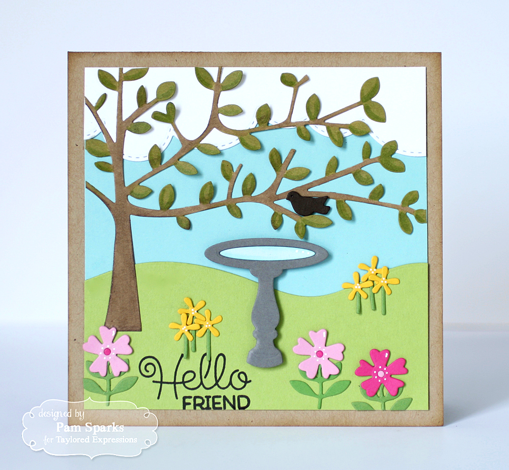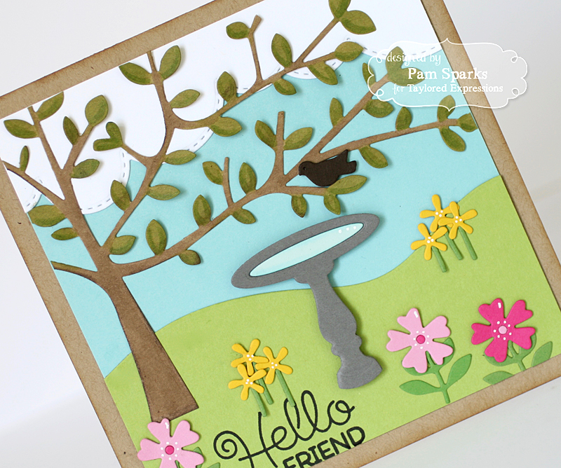 I used the birdbath, the bird, the little yellow flowers and stems from the set. (the stems are part of the bouquet die, I just clipped off the stems and used them)