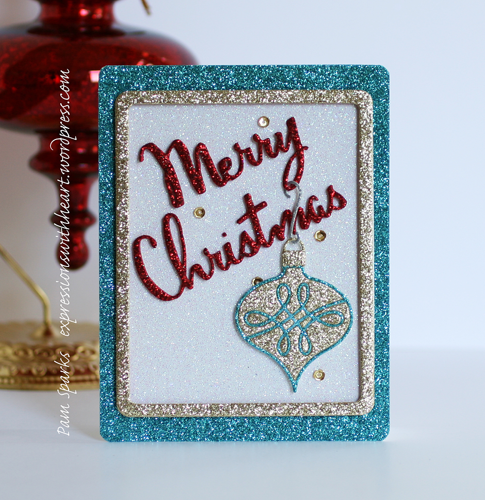 I die cut poppystamps Merry Christmas Script die out of adhesive glitter foam but that was challenging.  I think next time, I’ll just use the red glitter card-stock!  This American Crafts Glitter card-stock is so pretty!