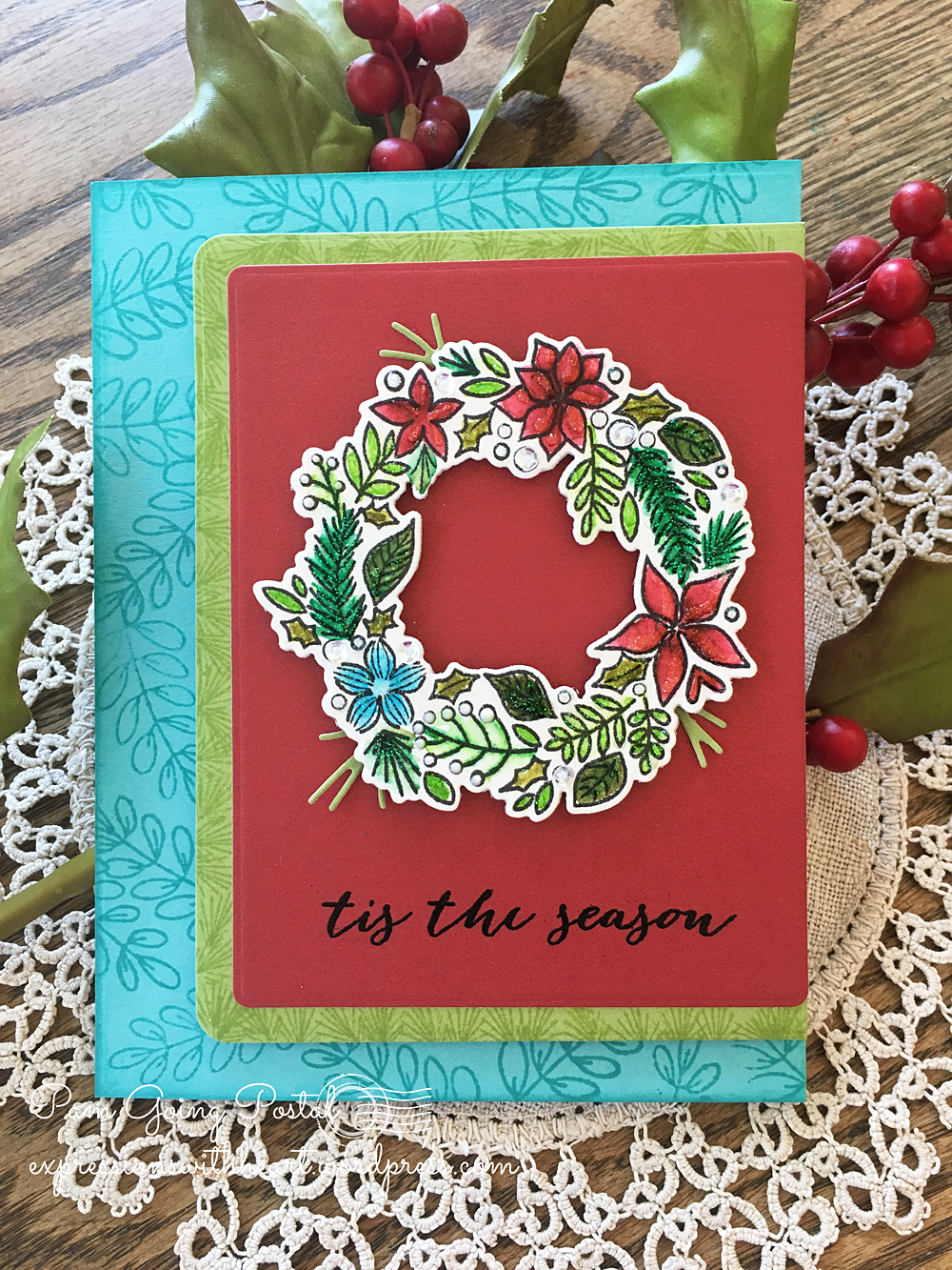 1. Well that is just beautiful! I love the aqua with the traditional Christmas colors! Your watercoloring is gorgeous and I love all the sparkle and shine! Can’t get enough pine branches either! haha!