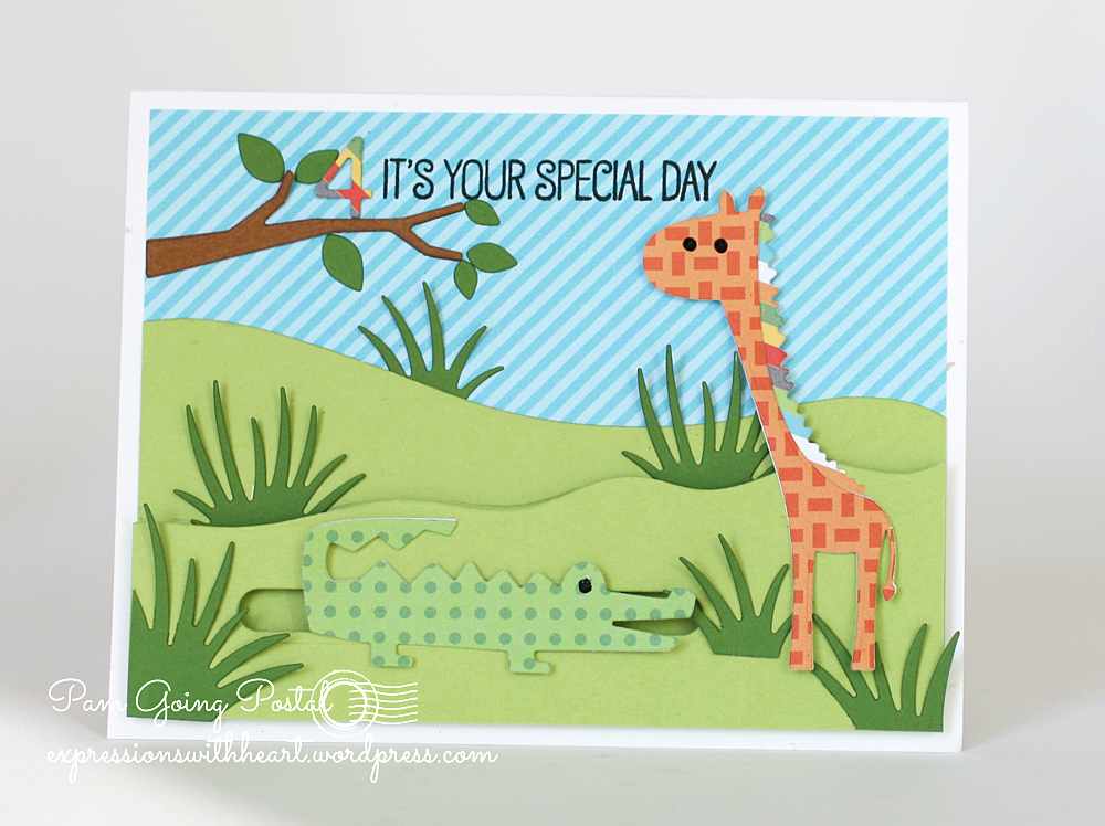 The birthday card for your Grandson is so fun! The giraffe and alligator are so adorable! The pattern papers are so fun and what a fantastic scene..so cute!