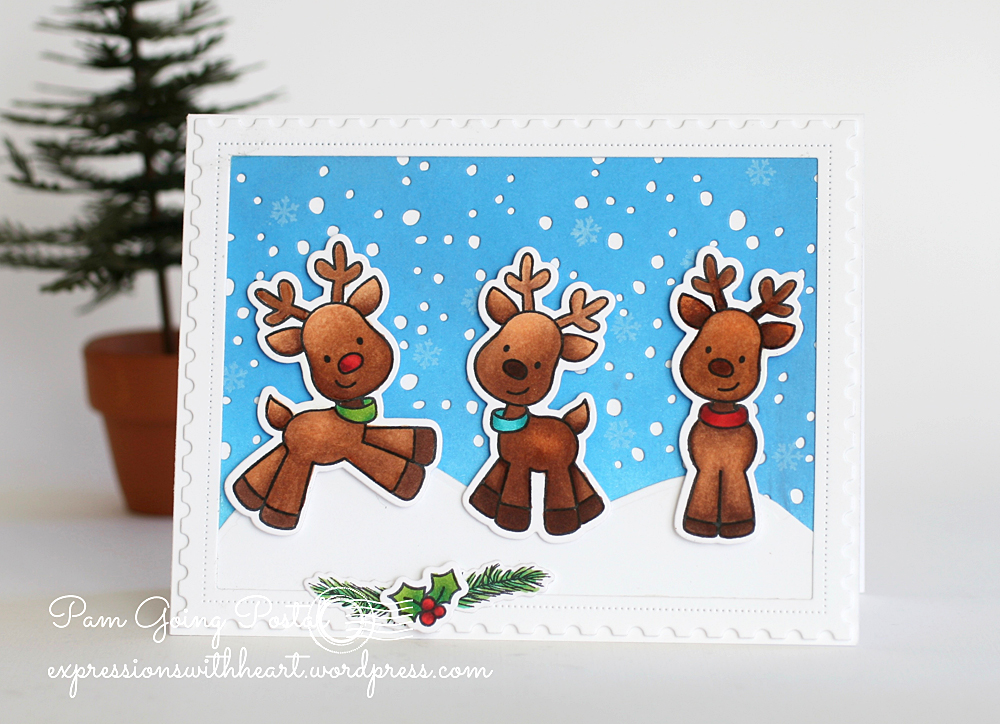 oh my goodness, pam, this card could not be cuter!! the reindeer are adorable and the one on the let certainly looks like he can fly like rudolph. i also love all the dies you’ve used; the falling snow die would make wintery skies a lot faster than my one dot at a time method. 🙂 i bet your grandson will love it.