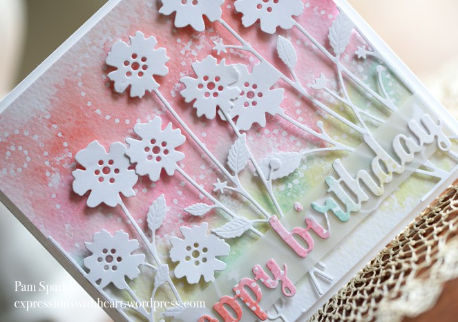 Wow, Pam. After reading how you achieved that wonderful background, I’m going to have to play with inking up a stencil and trying your technique. Love the results. I especially like the way you’ve alternated the watercolor effect with plain white. It makes the die-cut flowers “pop” and having the vellum behind the watercolored sentiment creates the same effect. Great card. Thanks so much for joining our Watercooler Wednesday Challenge this week.