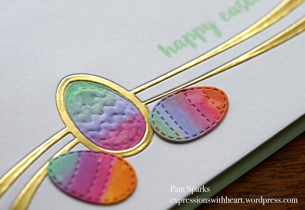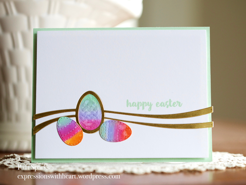 3. two gorgeous cards pam! wow, the gold is so elegant on the first one and i love the sequins. the second one is so bright with those beautiful and colourful eggs and i love the soft green sentiment – i need that one. oh, but when i check your inlinkz listing, i realize i have it and not yet used it. lol. maybe i don’t need any more supplies.