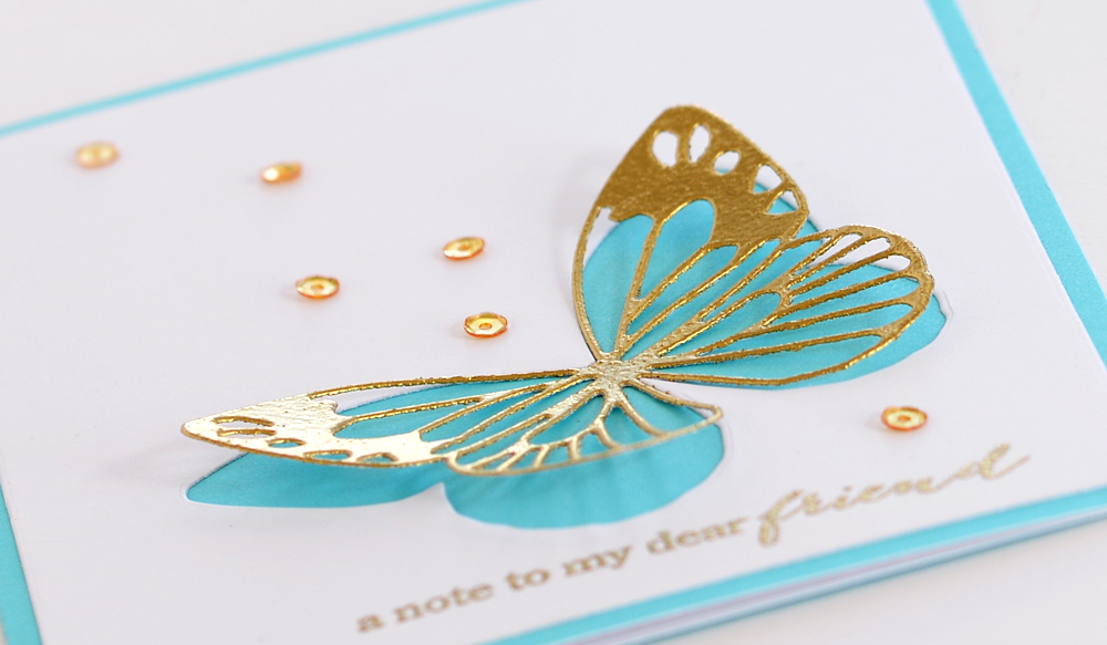 Just a note…a pretty gold embossed butterfly on my first card today.  I die cut a white card-stock panel with the Rectangle Basic die set, then die cut the Corden Butterfly die in the panel.
