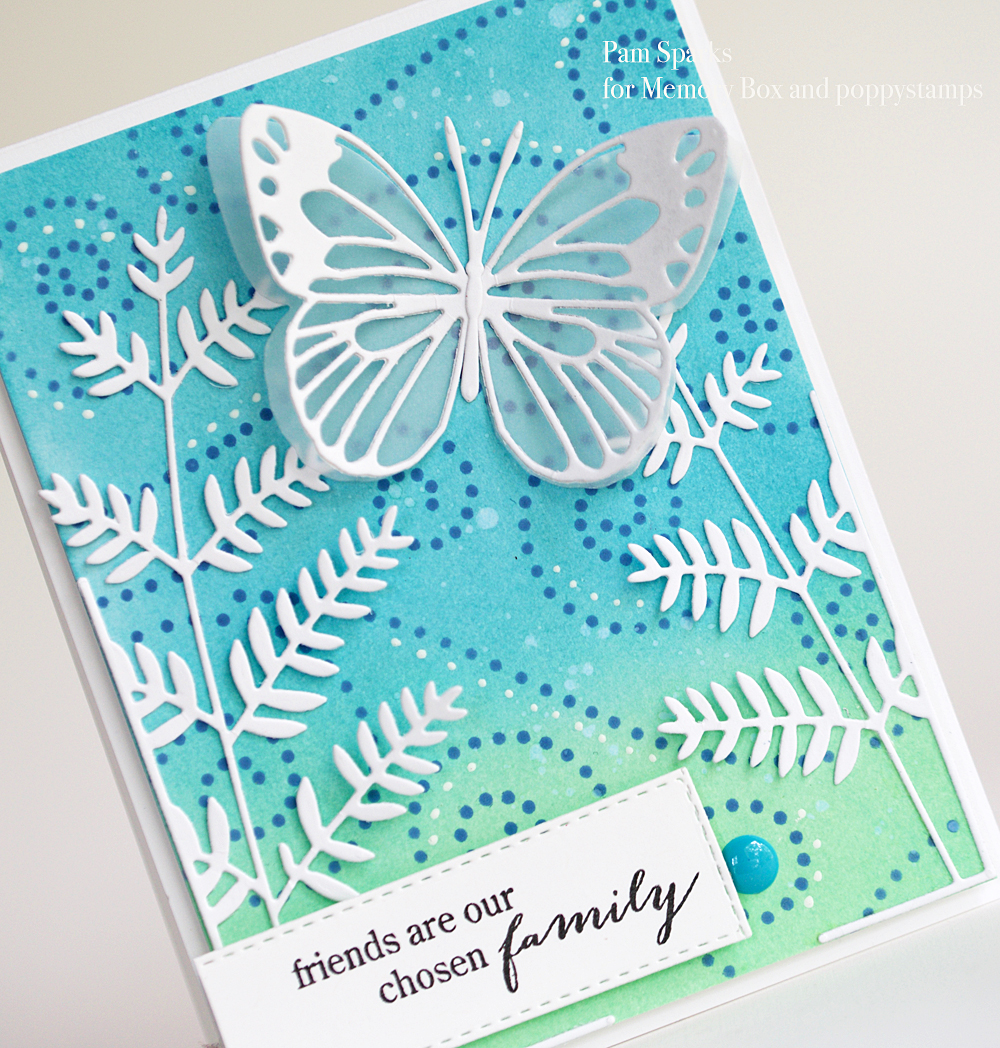 I might miss the boat on the oxide inks. I know… tsk tsk me… but just look what you’ve done! Enough awesomeness here for both of us! Fantastic dies and backgrounds with gorgeous combinations. The balloon die background does not look imperfect at all. It looks perfectly great! And, of course, beautiful background there with your daughter’s woven masterpiece. She’s amazing! You survived and came into your own without her. Too bad they discontinued that Cross Stitched Border die. One of my faves and I use it a lot. I have one of the ferns. Used it once, but didn’t care much for the card. Love the die, though, and I totally love what you did with it. Oh, and now I want to get my butterfly dies out again. Huge lots of inspiration here today, Pam!