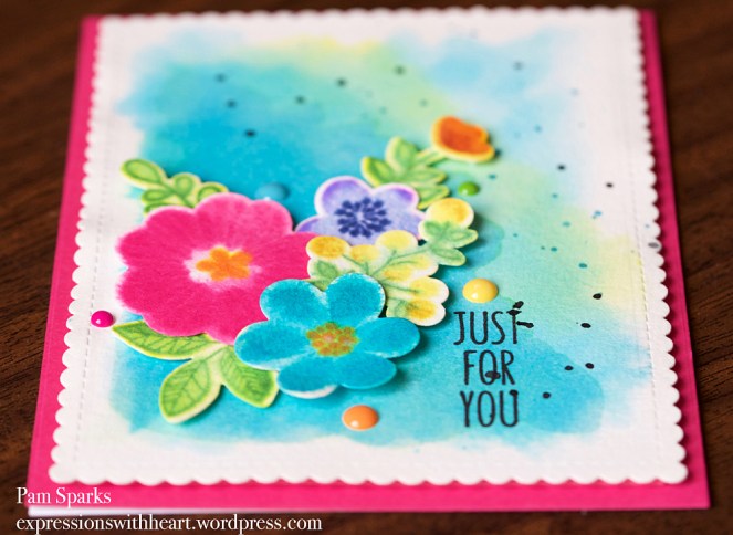 11. Pam, your watercolored flowers are beautiful. This is a technique I’ve never tried (never even heard about until now….thank you) but will be checking out the video. I’m so glad you shared it with us at the Tic Tac Toe Challenge this week!