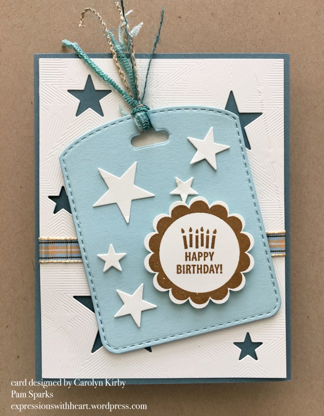 The tag is a Taylored Expressions Build a Tag die and the background is a Memory Box star texture plate that’s discontinued.
