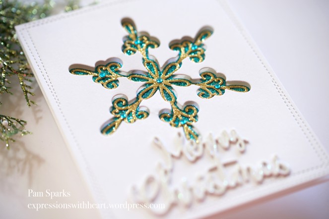 I used the Outline to cut the white top panel and the turquoise glitter card-stock. I die cut the Chancery Snowflake in gold glitter card-stock and glued it on top of the turquoise outline die cut.