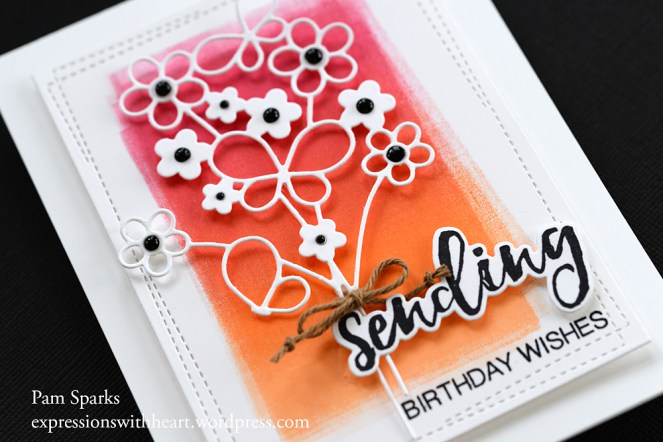 Such a pretty and cheery card, Pam! But i still *need* my coffee. 🙂 i love the die; the contrast between the open and solid blooms and i love the contrast between the black and the background inks. I like the cooler black of the archival but use versafine for detail, especially on my heavy watercolour papers.