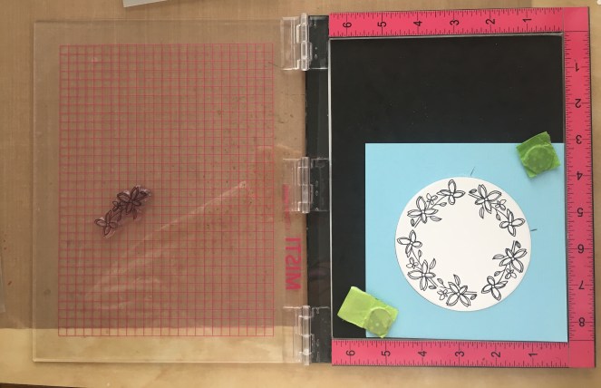 Last week I was playing around with stamps to make wreaths. I die cut a 3 ¾ inch circle, stuck the negative in the MISTI, marked the area where the first image kinda landed and then I kept moving my inner circle focal piece around to stamp the complete wreath.
