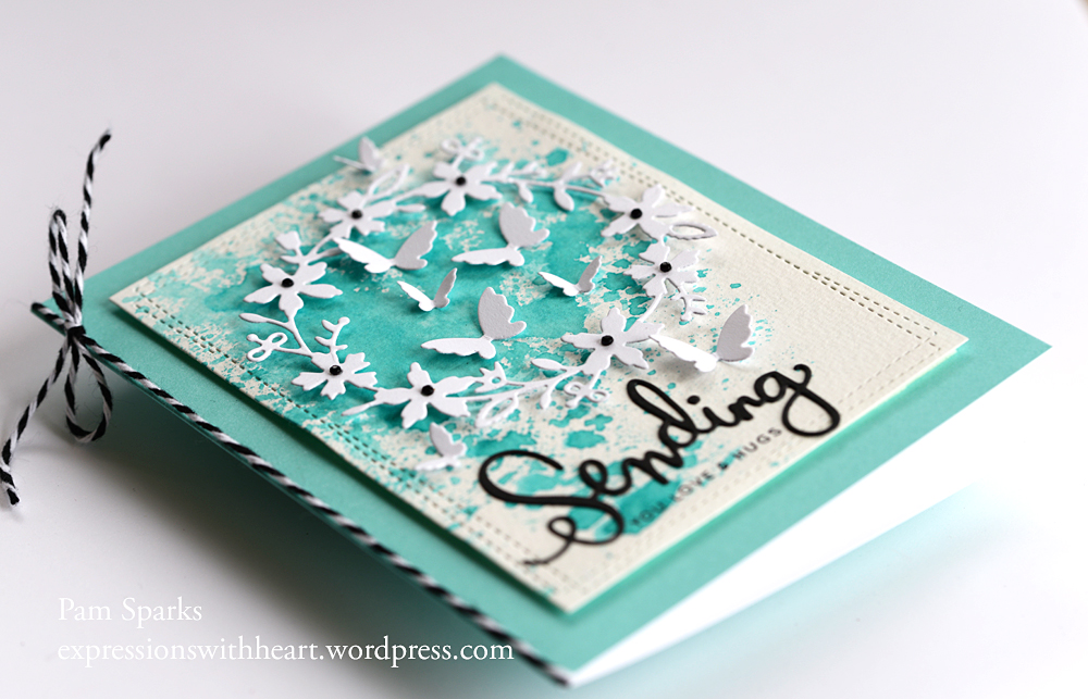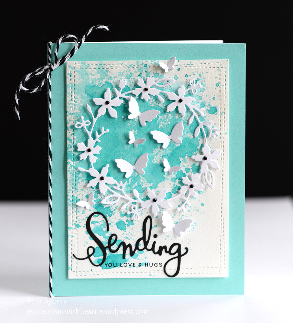 Here I combined the NEW Flickering Butterflies die and SSS Sending and Wishing stamp and die sets with Memory Box Devonshire Wreath and Wrapped Stitch Rectangles dies.