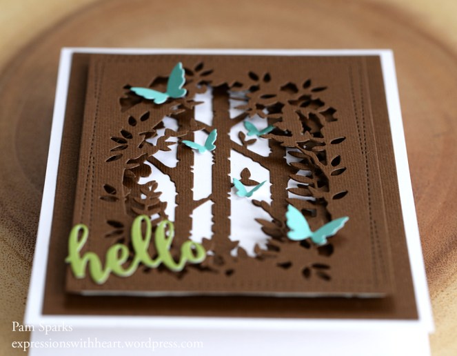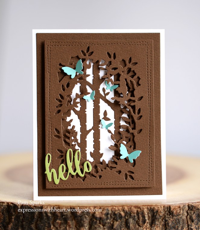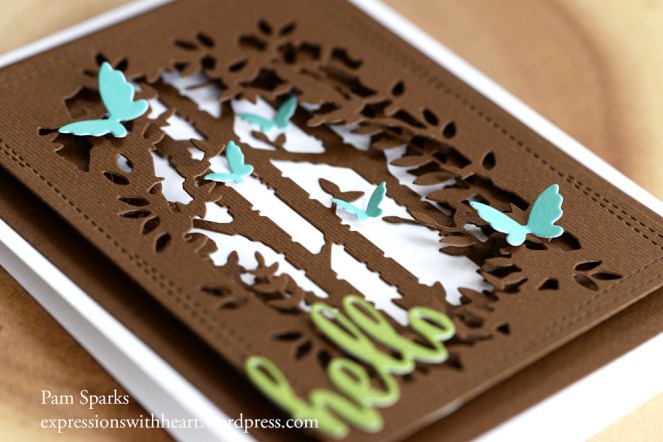2. Oooh, the butterflies with the wreath sure are pretty, and you matched up the ink and paper colors so perfectly. Love that smooshy background, and I also love Memory Box notecards and card stock. The butterflies are just as pretty flitting through the forest. I like things all woodsy brown as much as I like feminine colors. Two awesome cards, Pam!