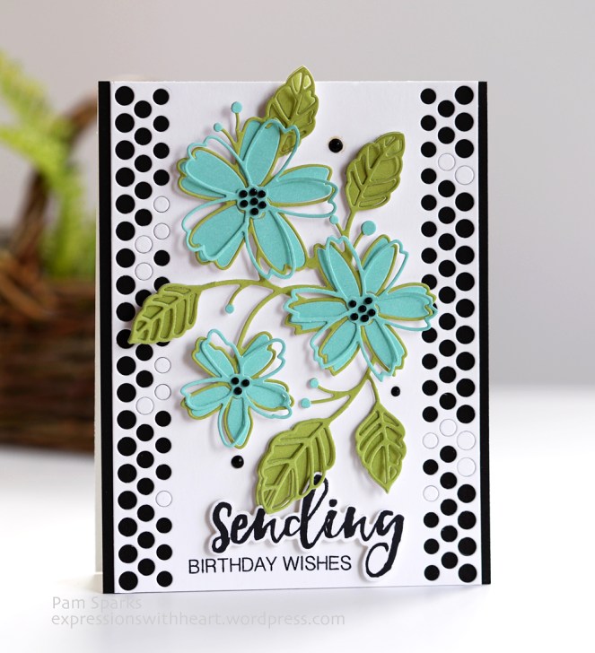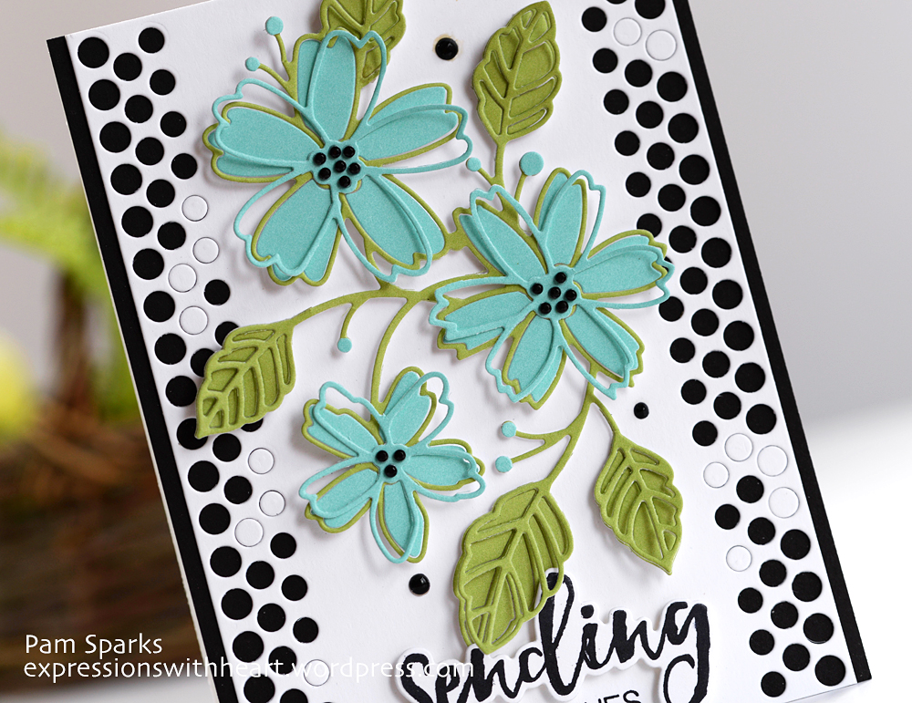 Wow! Who needs ink blending when it’s this gorgeous? The fabulous flower die, colors, the dotty borders with some circles unpopped — love! Also love how you offset the outline. This is fantastic, Pam!!