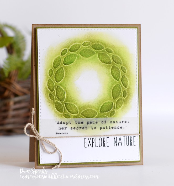 Using the ink blending tools and 3 Distress ink colors, Twisted Citron, Mowed Lawn and Peeled Paint, I added color. I thought it was so cool, I did the same technique (embossing/inking) for my next card but added a kraft color panel with the Leafy Circle cut in it over the top of the ink blended piece. whew… run on sentence.