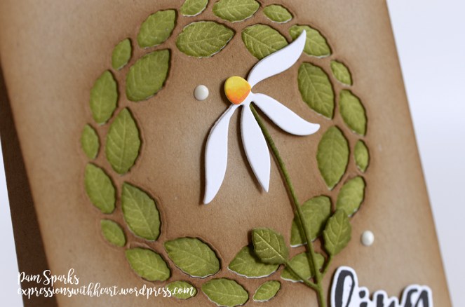 This time I ink blended with Peeled Paint and Forest Moss Distress Inks. Colored the flower head with Copics and added three Nuvo White drops. I used mounting tape behind the flower, the flower stem leaves and the sending die cut.