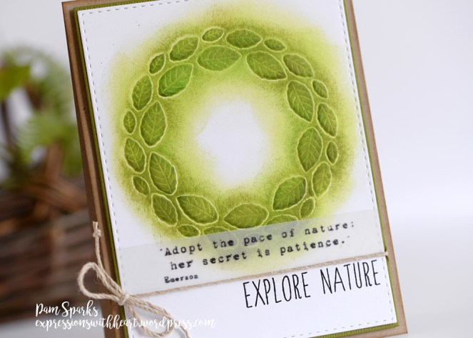 I stamped the sentiment on vellum with Ranger Archival ink, trimmed it and used the Glue Dots Vellum adhesive on the back, just gotta tell you, that worked slick. Then I stamped explore nature on the white panel with the same ink. Stamping for both using the MISTI.