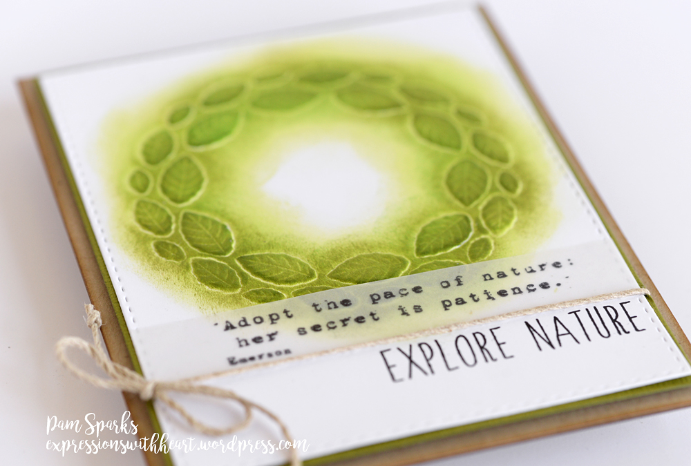 Using the ink blending tools and 3 Distress ink colors, Twisted Citron, Mowed Lawn and Peeled Paint, I added color. I thought it was so cool, I did the same technique (embossing/inking) for my next card but added a kraft color panel with the Leafy Circle cut in it over the top of the ink blended piece. whew… run on sentence.