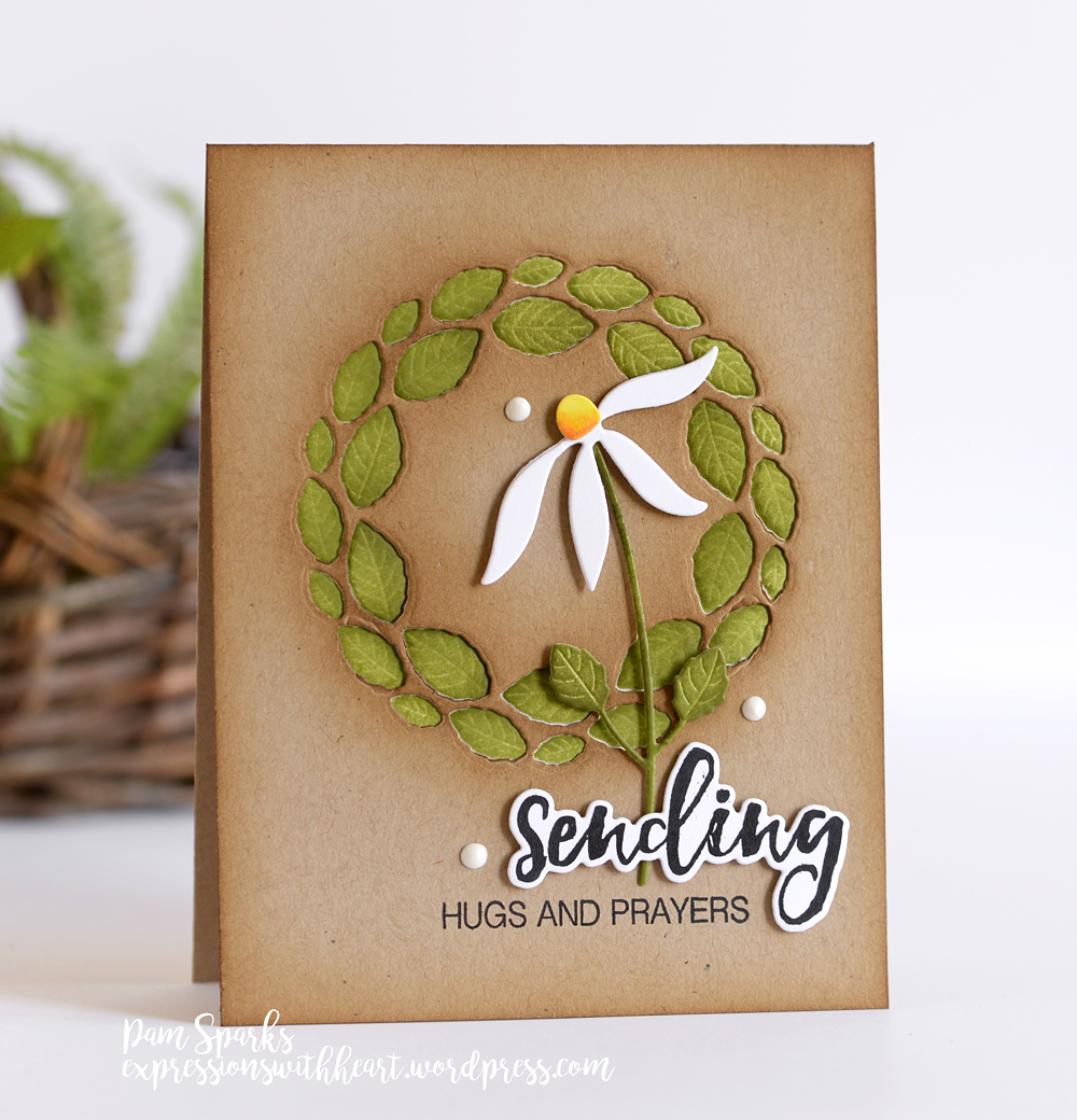 This time I ink blended with Peeled Paint and Forest Moss Distress Inks. Colored the flower head with Copics and added three Nuvo White drops. I used mounting tape behind the flower, the flower stem leaves and the sending die cut.