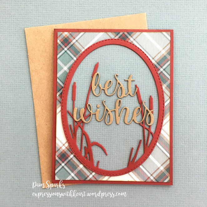 A masculine card to share with you today from the new MB/ps release. A panel of plaid paper…some textured cardstock to coordinate… the NEW Riverbank Oval die…cut first and then I put it in the Stitched Oval Layers die to run it through the machine again to get the stitch lines on it!  It’s a neat die either way but you know me… use as many dies as you can on a card Pam! haha