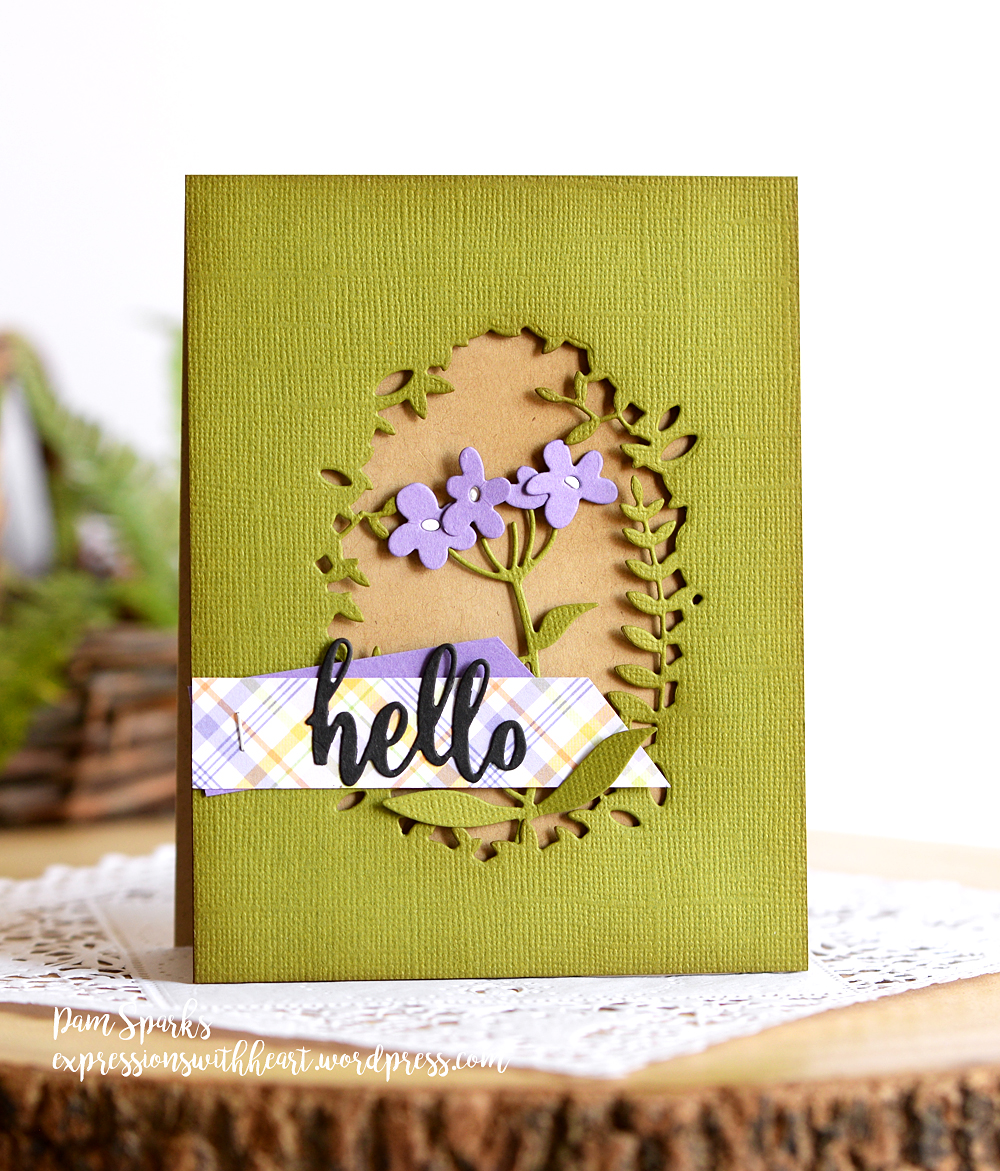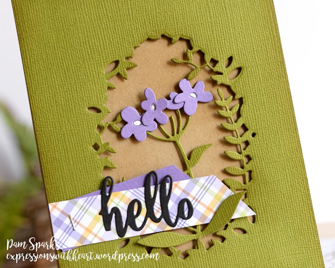 4. Oooh, I like the look of this die, but when don’t I like the look of the dies you use? Cute little flowers, all perky and sweet. Pretty all dressed up with the colorful flags and popping black “hello”. Good to see you, Pam!