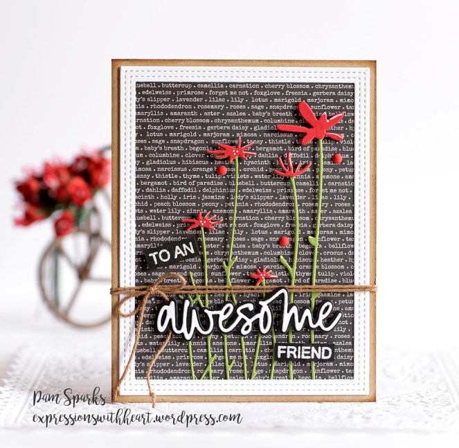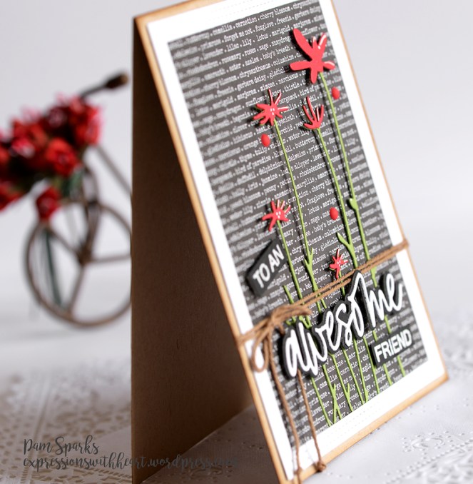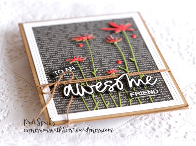 Hi awesome cardmakers and friends!  I started out with the new poppystamps Tall Sketch Daisies and of course I needed words to go along… the new Memory Bos Awesome Jotted Script fit the bill!  The cut apart clear stamped and embossed accessory sentiments came from the poppystamps Sentiments of Hello clear stamp set.