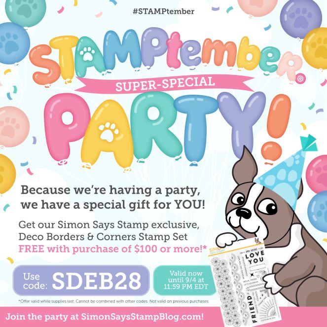 Hi everyone! Welcome to my blog post for the Simon Says Stamp STAMPtember Party! You’re invited to join the fun…visit all the blogs linked on the Simon Says Stamp blog HERE! Click to shop and use your code choice to receive an exclusive gift (several options) with your order! How awesome is that!!!