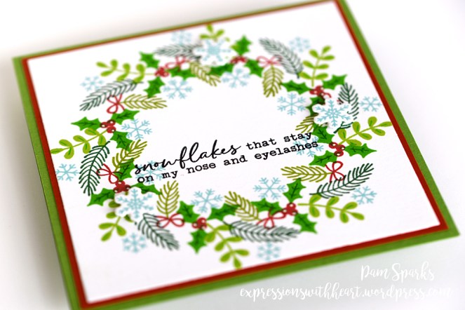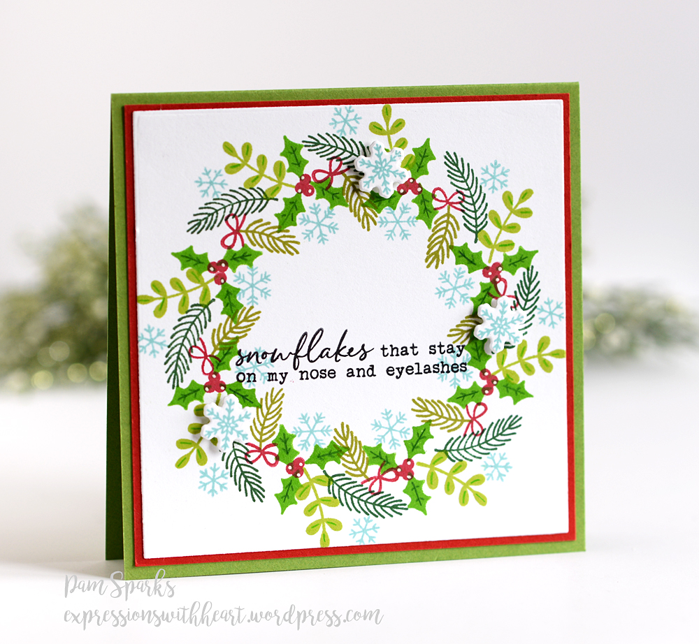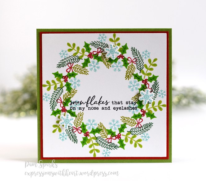 It’s definitely blogworthy and absolutely perfect! I had to look at the set again to see all those small pieces. You sure put them to good use! Love the wreath builder sets. The first has been on my wish list forever. Your card is fresh and pretty and fun, Pam!