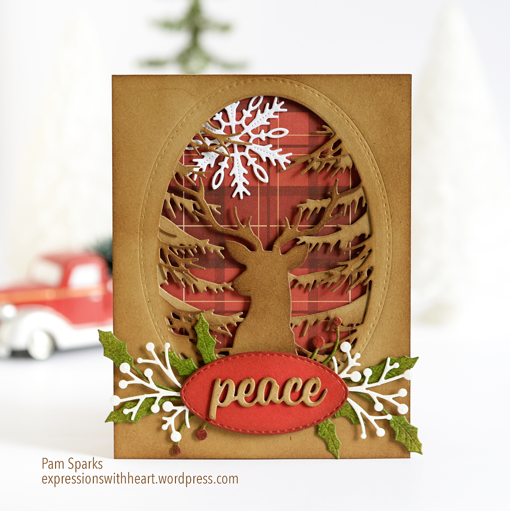 The beautiful snowflake is from the NEW Pinpoint Snowflake Circle Frame die cut in white.  The NEW Peace Cheshire Script die is cut three times from Kraft and glued together, then inked with Gathered Twigs Distress ink.  I inked the card edges and the deer with Gathered Twigs ink also.