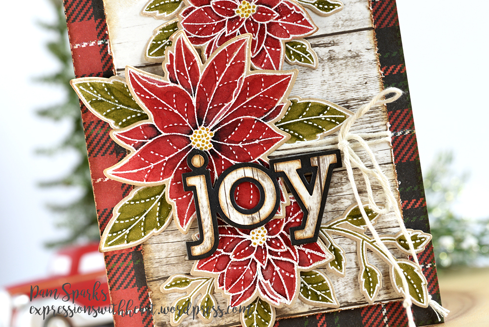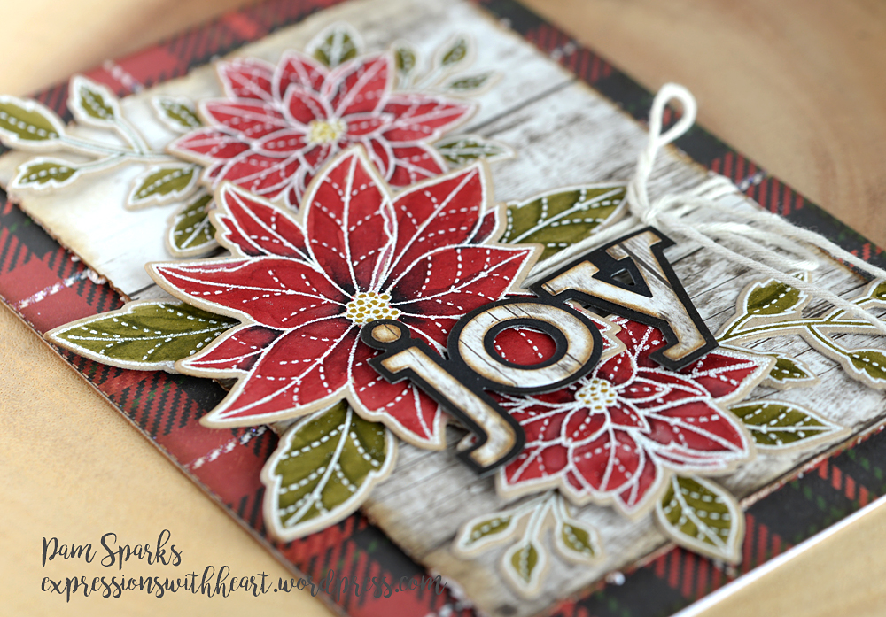 Beautiful! Did you put gold around the edges of the Poinsettias? Your joy looks like you burned the sentiment into a piece of wood, it looks amazing. Wonderful card. ❤