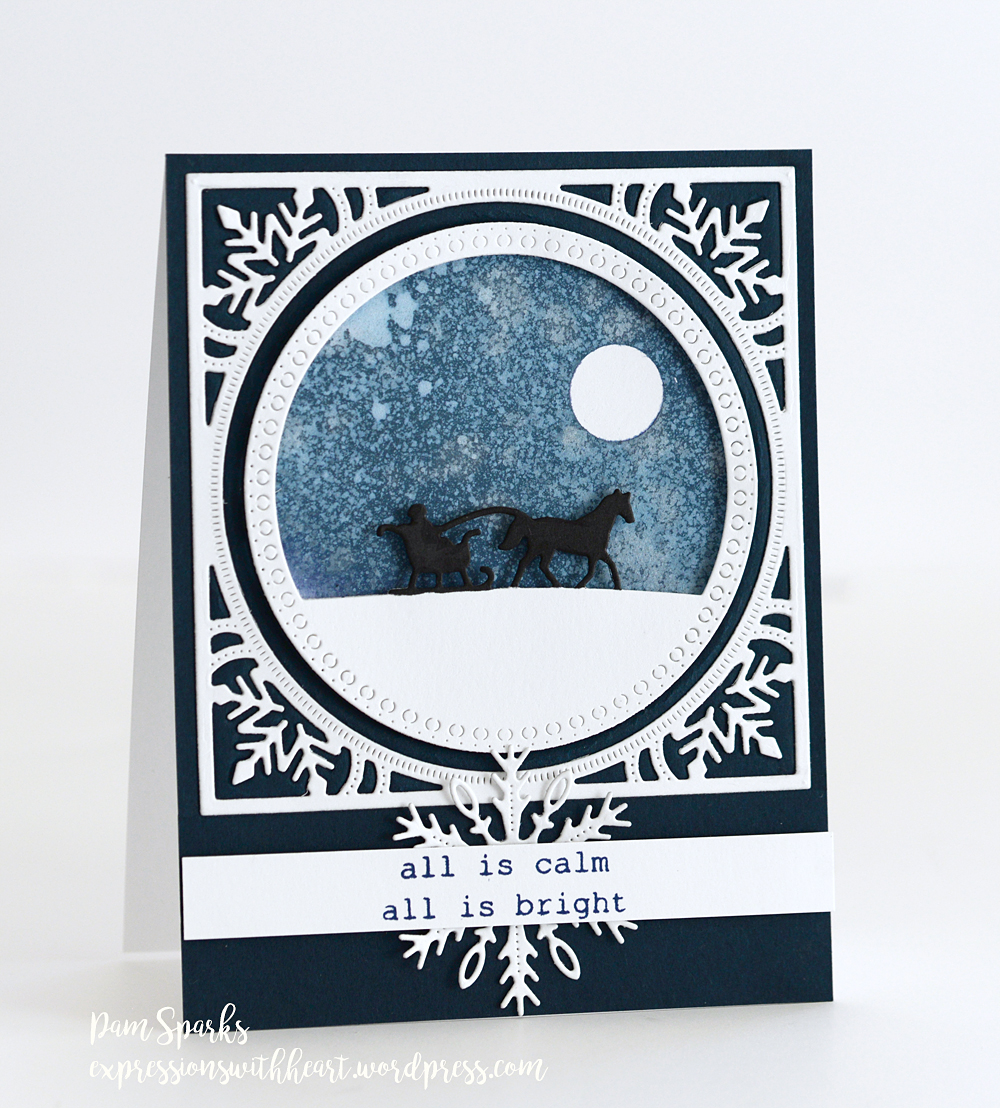 I cut small strips of mounting tape and put them here and there around the back side of the circle frame, mounted it to the ink blended background circle die cut, glued the square frame to the card base, glued the circle to the card base, die cut the snowflake from the New Pinpoint Snowflake Circle Frame and glued it on, stamped a strip of white cardstock with a sentiment from the NEW Typewriter Holiday Sentiments stamp set, applied mounting tape to both ends and stuck it on! I love the white contrast with the dark blue!