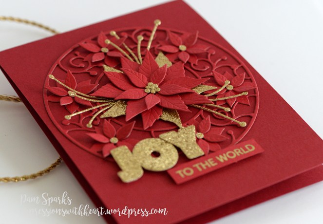 The only things that are on mounting tape are the JOY and to the world sentiments. The JOY die is part of the poppystamps Tidings of Joy stamp and die set.  The JOY die in this set is really a backer die but I didn’t like it stamped so I die cut each letter of the JOY separately and trimmed them to fit together just like the die but the letters were defined then.  I put the letters back into the die to hold them in place and put the mounting tape to hold them together.  Slick!