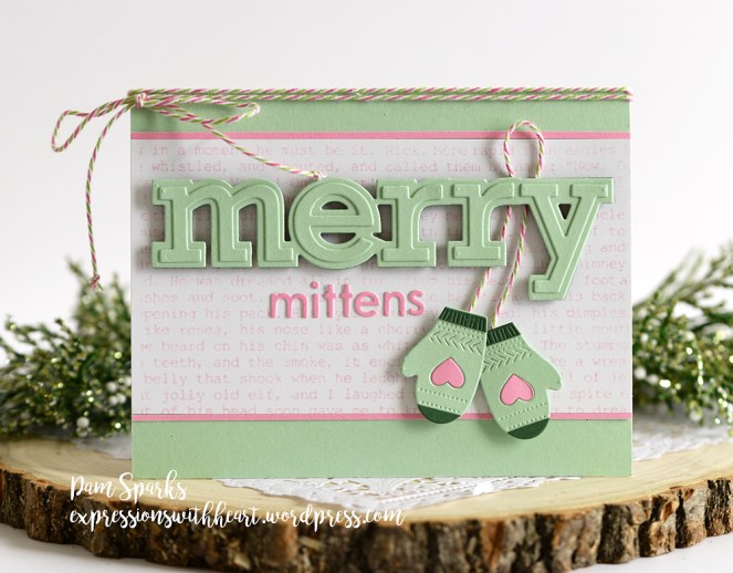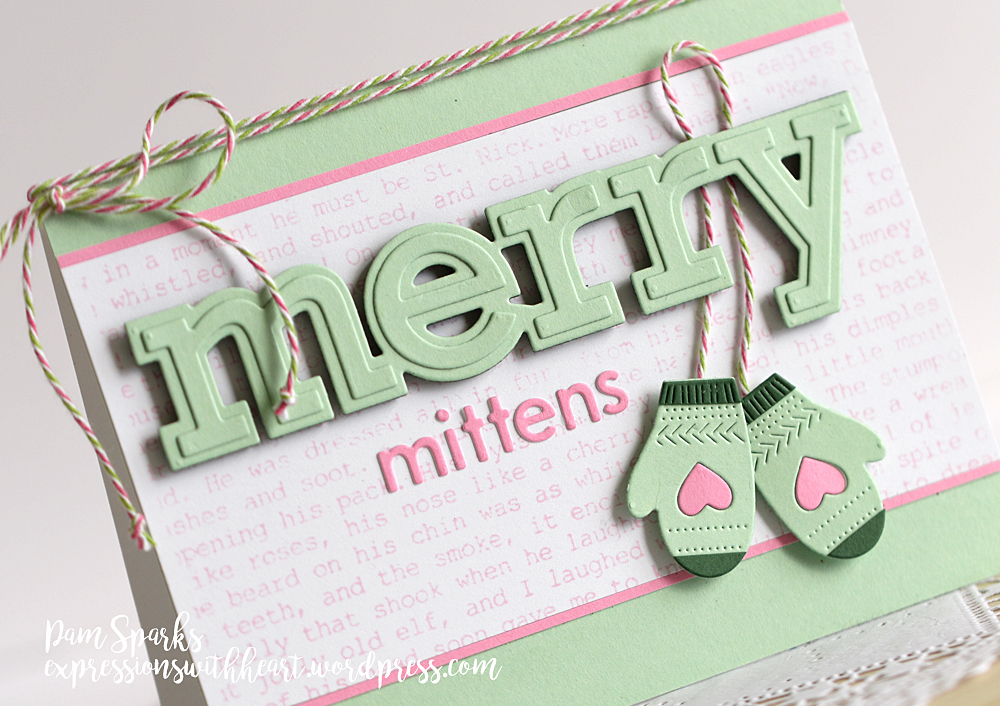 I love this big merry outline die though and these sweet mittens.  I used the new background stamp from the Typewriter Holiday Elements set too.
