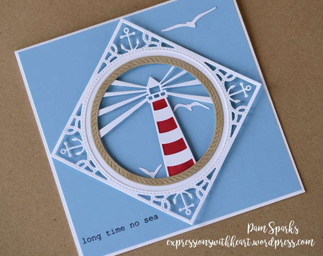 I added the Memory Box Flying Gulls in the background, glued directly to the card. The lighthouse and the circle part of the frame have mounting tape behind them. Nothing under the points/corners.