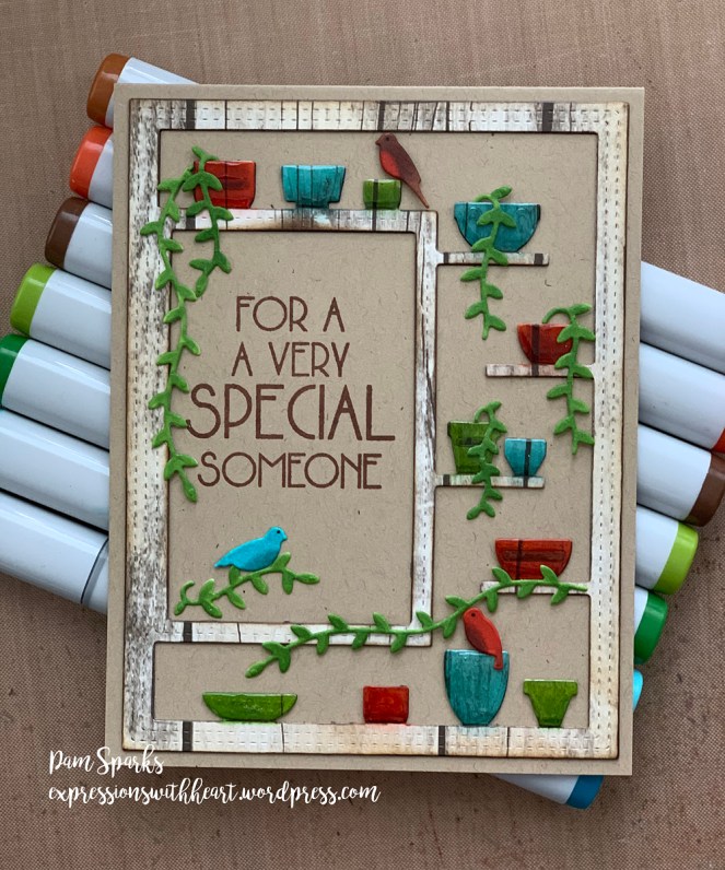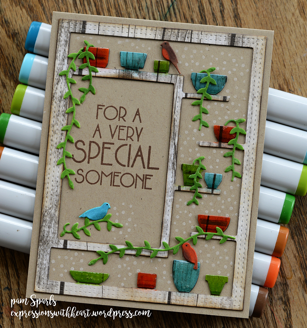 I die cut the frame in a piece of woodgrain pattern paper. Colored over the flower pot parts with Copic markers, BG53, 57, YG 25, 17, YR18, E99 and the birds with BG53, 57, E57, E99. I die cut the frame from a piece of cardstock and glued the pattern paper to it, making it sturdier. Then adhered it to the cardbase.