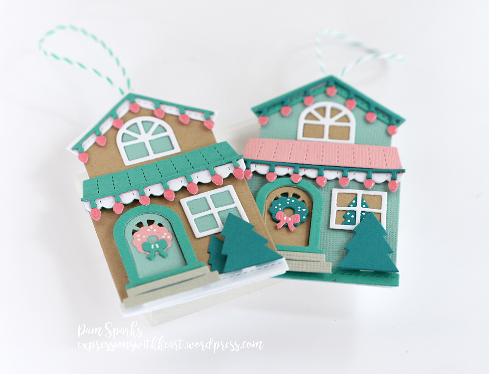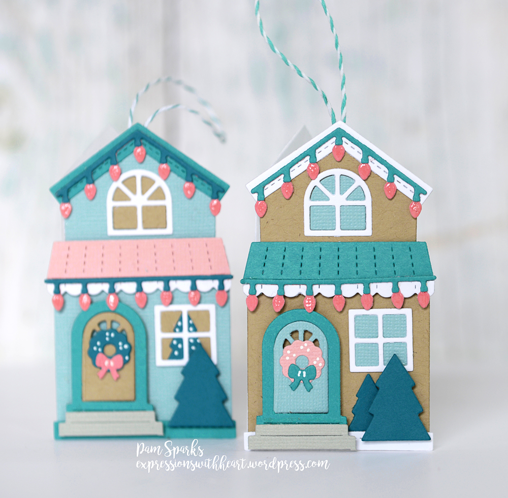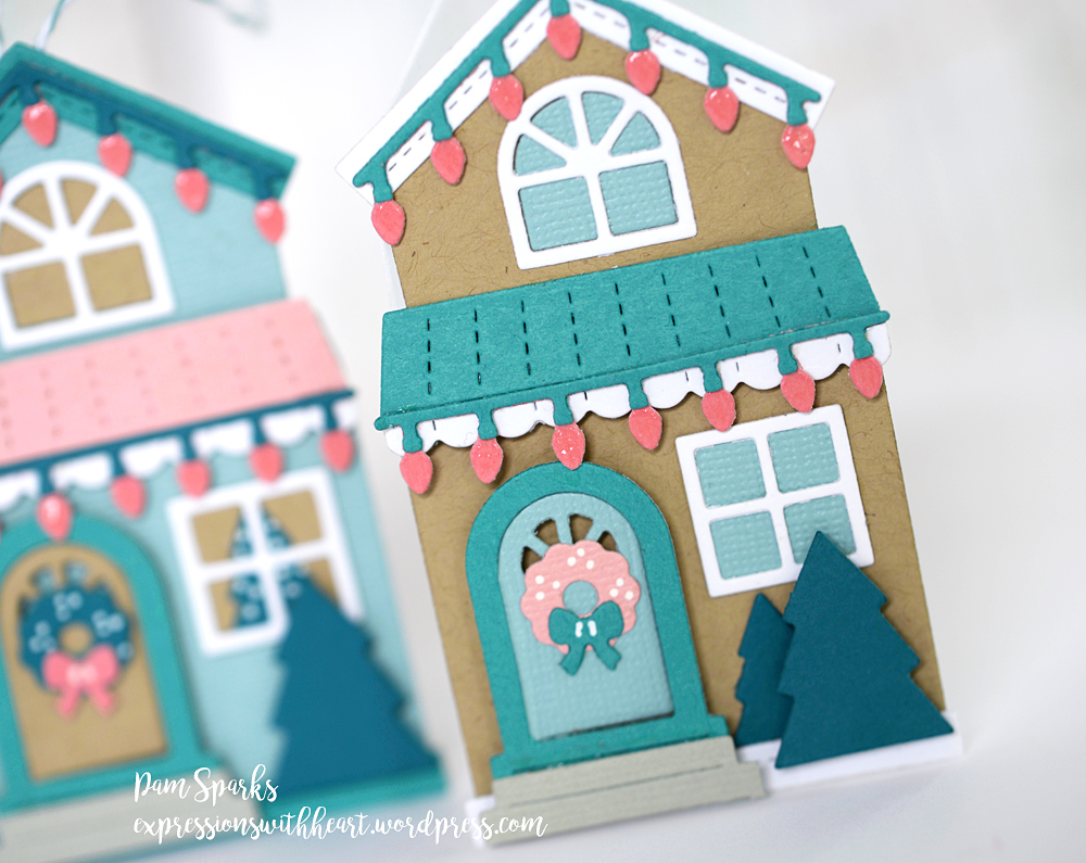 I did end up adding some white gel pen embellishing and glossy accents to the light bulbs. I die cut the main house piece inside the fold so I’d have a tag with an opening card. If you look close, you can see that’s how my tags are standing up.