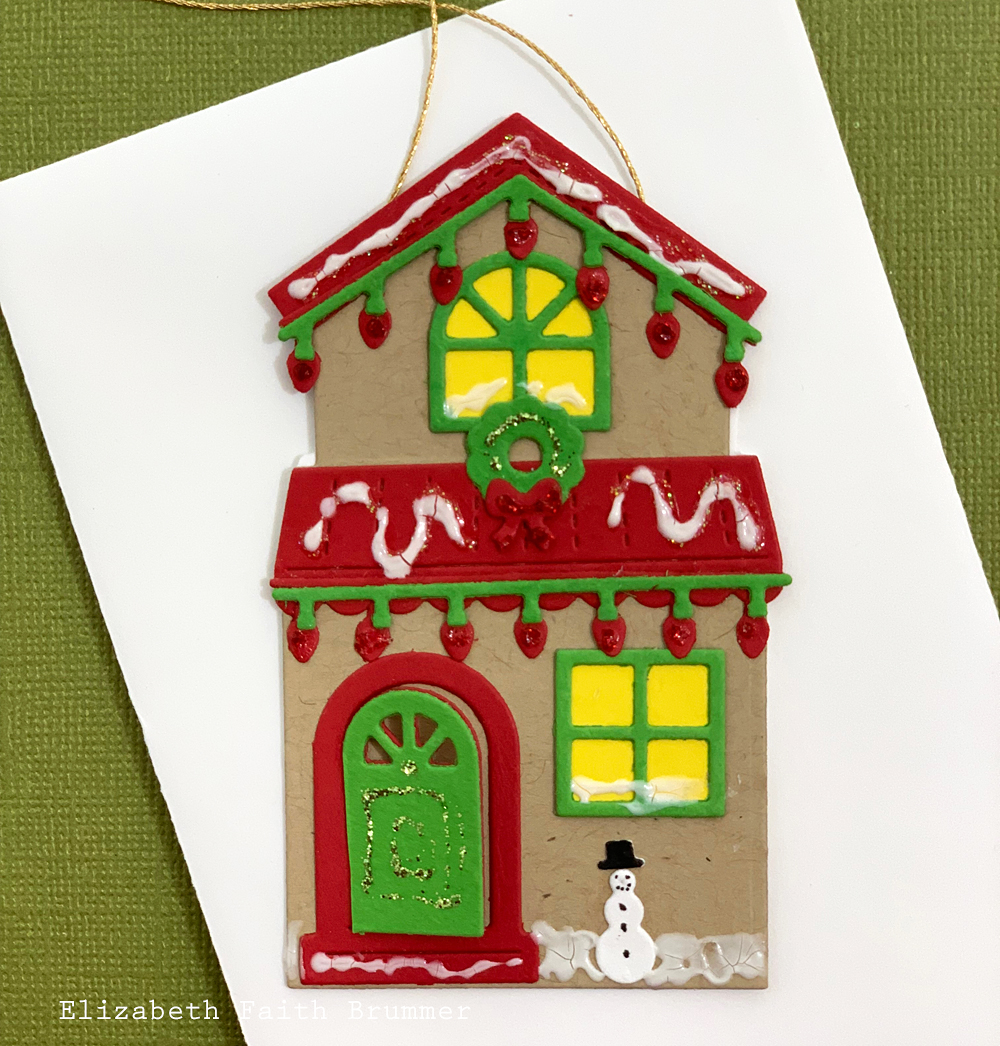 And here’s her finished tag! She added snow and sparkle! A sweet gingerbread house!
