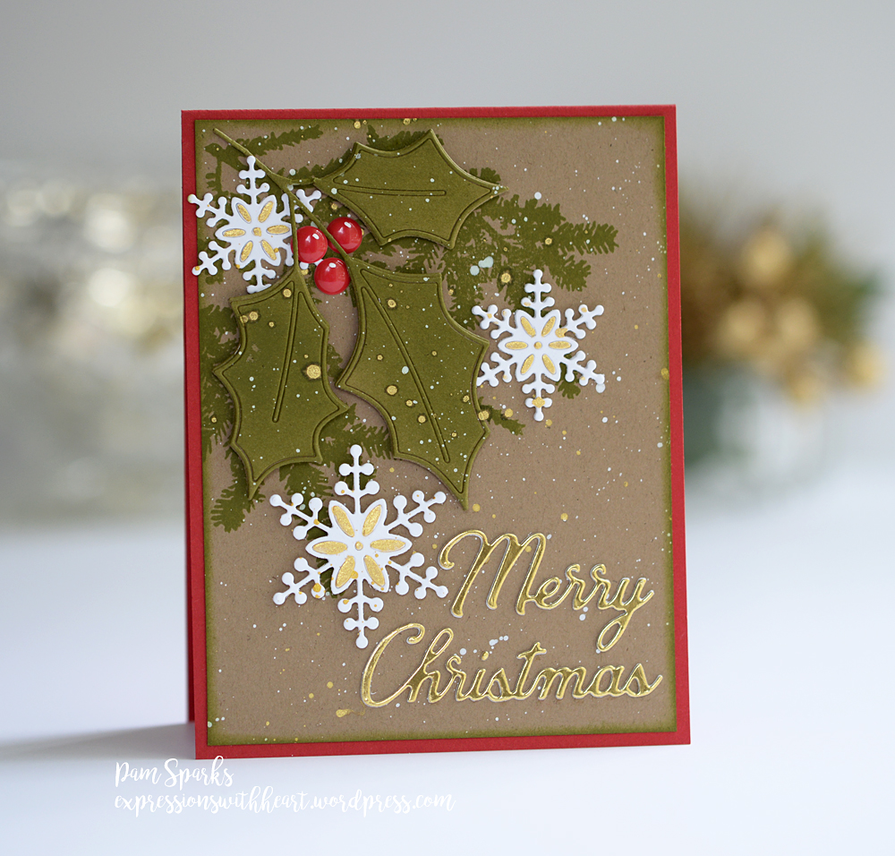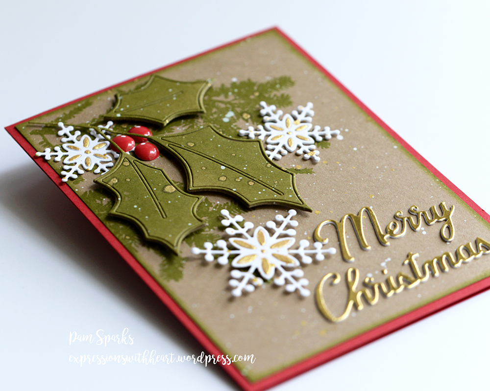 Pam – this card is a stunner! I really like the olive green stamped on the background and used again in the greenery die – it really works well with the kraft and touch of subdued red! Beautiful!