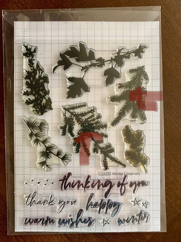 I started out by stamping some of the greenery from the new Winter Greenery clear stamp set. I used the two branches marked in the photo below. I stamped one of them twice so I had three images behind the holly.