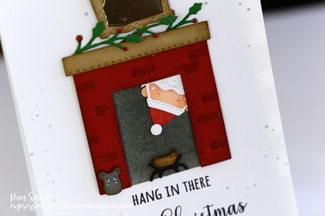 Here I did some die cutting, inking (same gathered twigs Distress ink, it’s always on my desk), a little Copic coloring on the bricks, Nuvo drops on the berries and gluing! Oh, I masked off the area inside the fireplace and ink blended Black Soot Oxide on the cardbase and spattered it… oops. it got everywhere and you can’t even tell I spattered the area I wanted spattered! lol