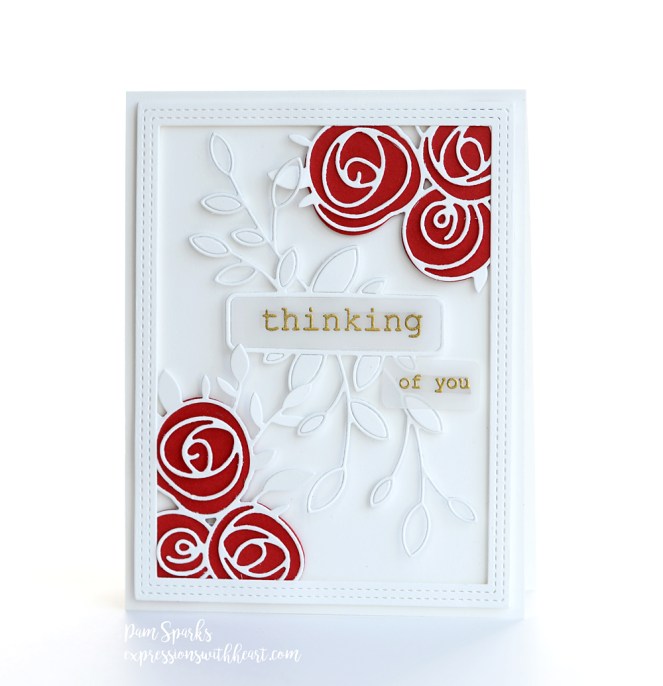 I die cut and glued the Scribble Rose Trio die cuts behind the poppystamps largest Double Stitch Rectangle Frames die.  I cut strips of mounting tape and raised it up a little off the cardbase…mounting tape behind the roses too.